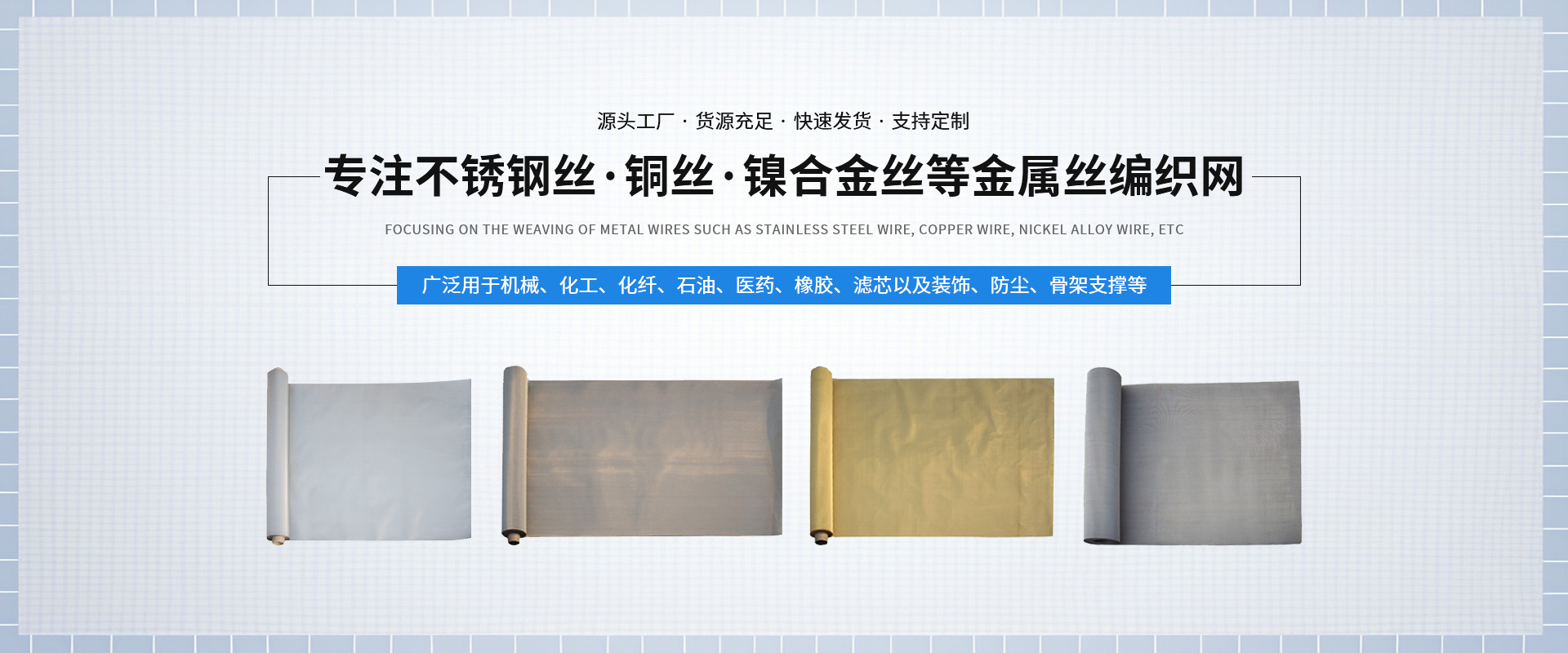 新鄉(xiāng)市中南金屬網(wǎng)有限公司成立于1999 年,公司設(shè)在河南省新鄉(xiāng)市。在過(guò)去的十幾年來(lái),我們堅(jiān)持以嚴(yán)格的管理措施、雄厚的技術(shù)力量、良好的工藝設(shè)施,質(zhì)量上乘、信譽(yù)為上為原則,把樹(shù)立良好的企業(yè)形象為工作宗旨,歷經(jīng)市場(chǎng)的嚴(yán)峻考驗(yàn)并贏(yíng)得廣大用戶(hù)的一致好評(píng)。金屬絲網(wǎng)編織結(jié)構(gòu)形式有平紋和斜紋兩種方法,嚴(yán)格按照航空軍品標(biāo)準(zhǔn)HB1862—93和標(biāo)準(zhǔn)GB/T5330—2003標(biāo)準(zhǔn),并等效采用國(guó)際標(biāo)準(zhǔn)ISO9044—90標(biāo)準(zhǔn)組織生產(chǎn)?! 」緭碛猩a(chǎn)設(shè)備和技術(shù)人員,主要生產(chǎn)不銹鋼篩網(wǎng)、磨料網(wǎng)、金屬絲編織方孔網(wǎng)、篩網(wǎng)、濾網(wǎng) 、篩分網(wǎng) 、過(guò)濾網(wǎng)、不銹鋼網(wǎng)、絲網(wǎng)、金屬絲網(wǎng)、金屬絲編織密紋網(wǎng)、特種網(wǎng)、不銹鋼密紋網(wǎng)、荷蘭網(wǎng)、席型網(wǎng)。絲網(wǎng)材質(zhì)選用黃銅、錫青銅、不銹鋼、純鎳等。席型網(wǎng)規(guī)格7/44目—500/3500目,方孔網(wǎng)規(guī)格1/2目—500目,網(wǎng)孔25mm—0.028mm,產(chǎn)品廣泛用于機(jī)械、化工、化纖、石油、醫(yī)藥、橡膠、濾芯、固體果粒篩分、流體過(guò)濾以及裝飾、防塵、骨架支撐等?! ∥覀円浴耙曎|(zhì)量為生命、以信譽(yù)求生存、以科技促發(fā)展、以?xún)?yōu)*產(chǎn)品為客戶(hù)服務(wù)”的經(jīng)營(yíng)理念,真誠(chéng)的希望與各界人士攜手并進(jìn),共創(chuàng)輝煌!